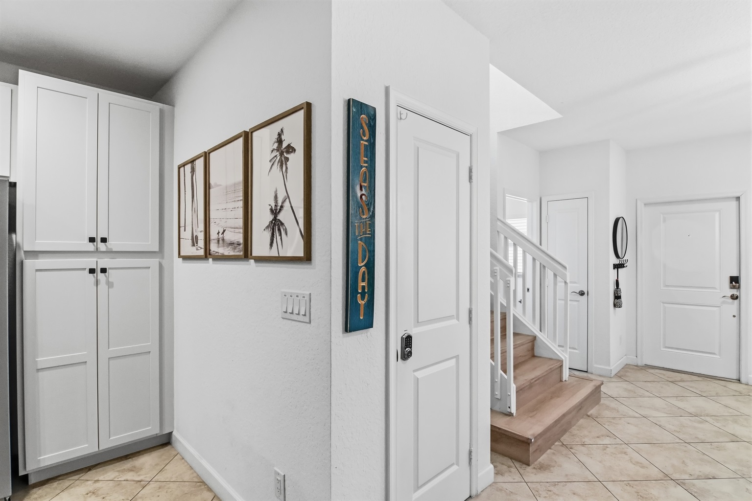 The 2 guest bedrooms are split from the Master Suite upstairs, and the guest bedroom are separated with a bathroom in between. One guest bedroom has a King size pillow top and the other has a Queen pillow-top. Both offer plenty of closet space, hangers, 100% cotton linens, a ceiling fan and flat screen TV's. The living room, fully equipped kitchen and dining room are downstairs with a half bath and sliding doors that lead to the pool and courtyard area.