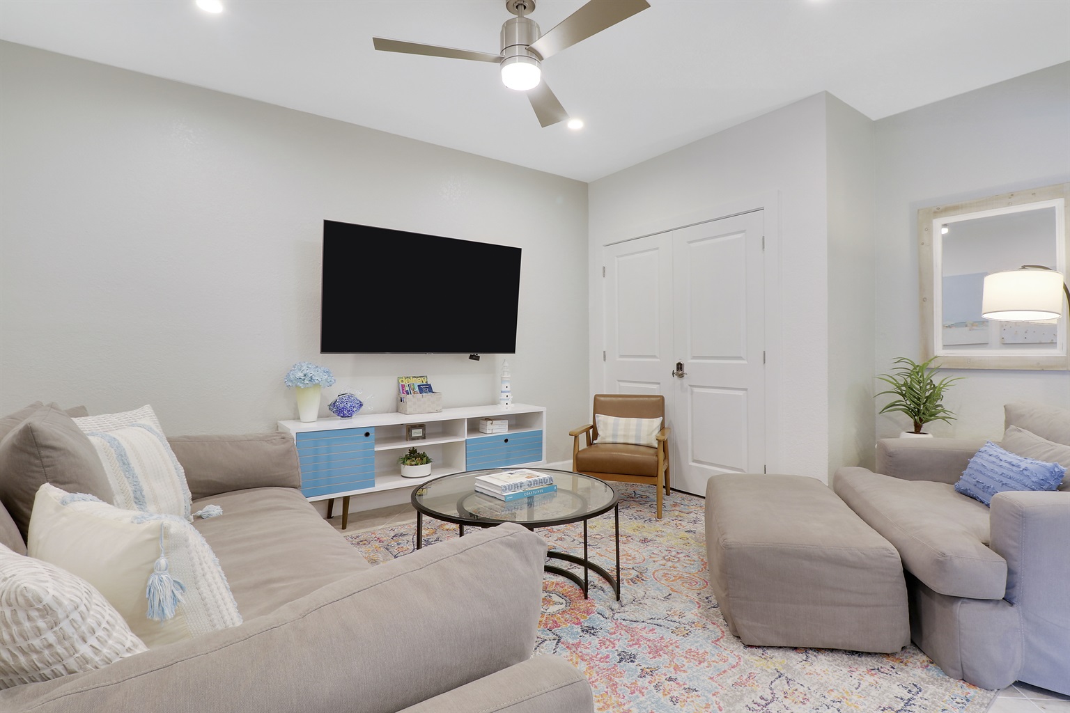 The 2 guest bedrooms are split from the Master Suite upstairs, and the guest bedroom are separated with a bathroom in between. One guest bedroom has a King size pillow top and the other has a Queen pillow-top. Both offer plenty of closet space, hangers, 100% cotton linens, a ceiling fan and flat screen TV's. The living room, fully equipped kitchen and dining room are downstairs with a half bath and sliding doors that lead to the pool and courtyard area.