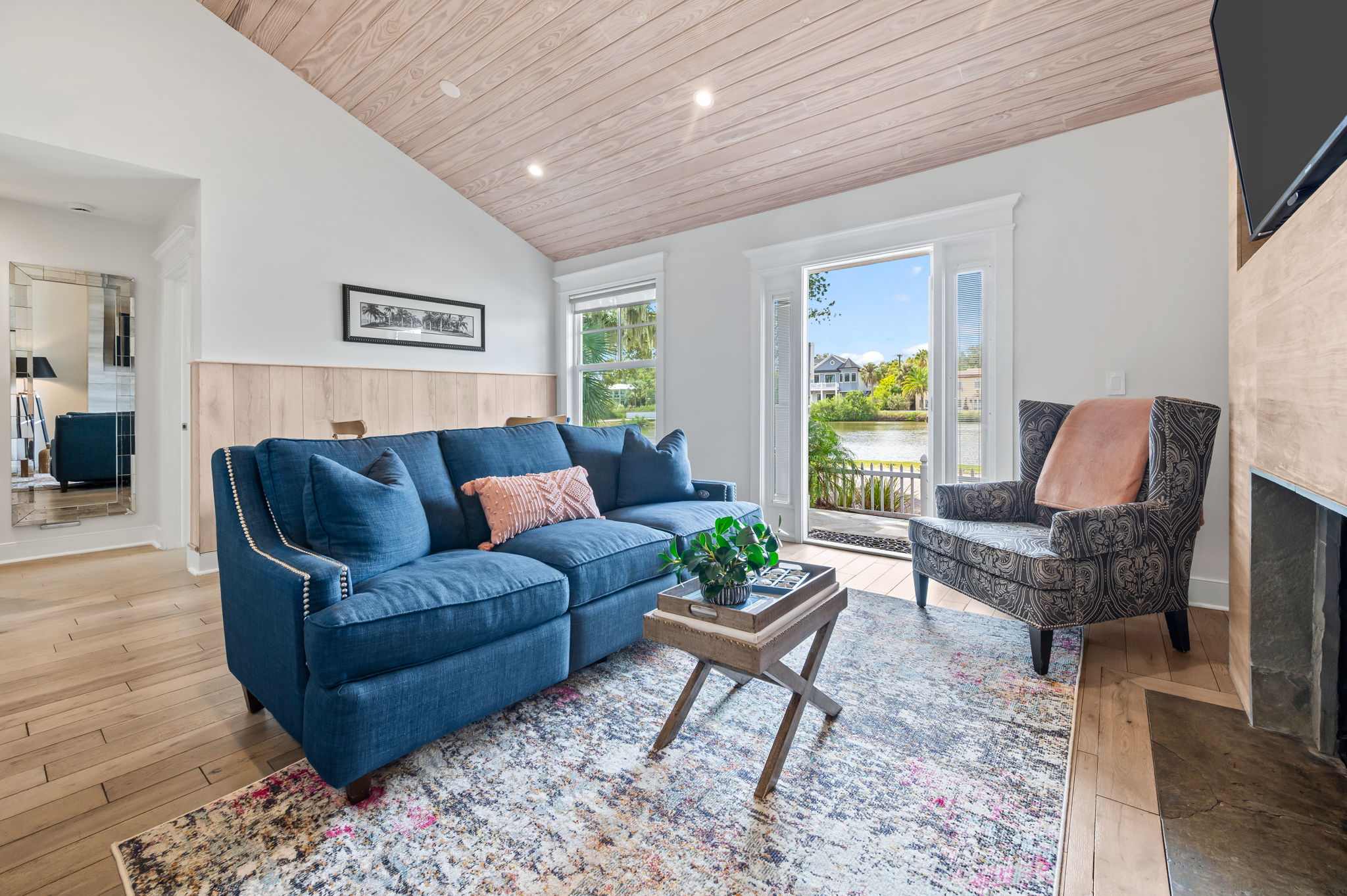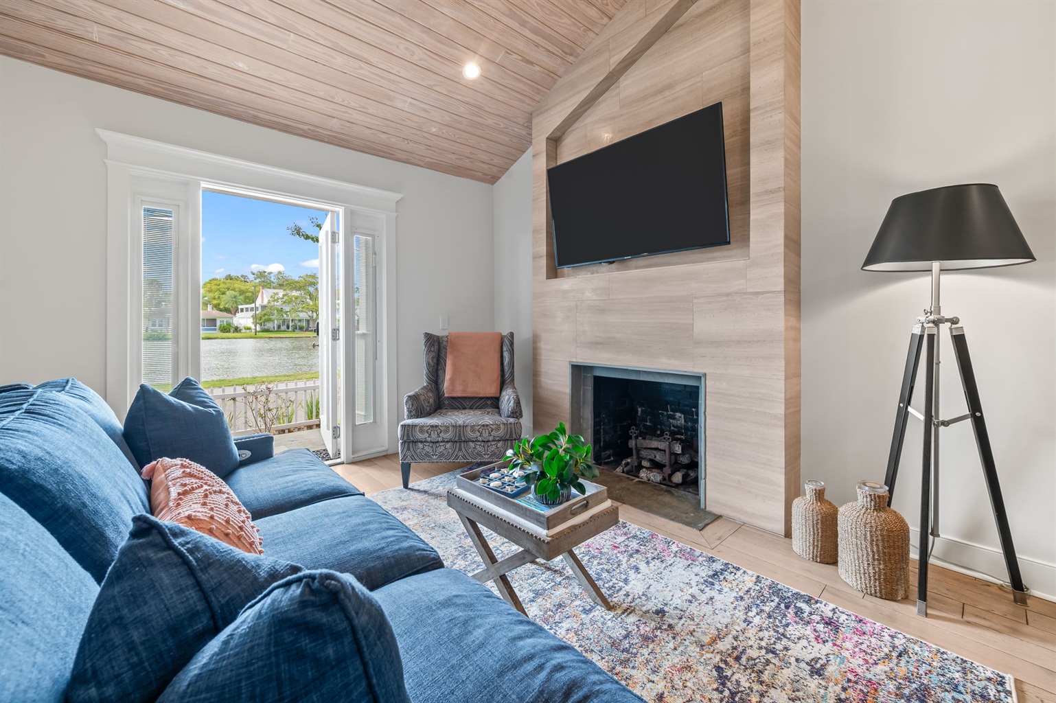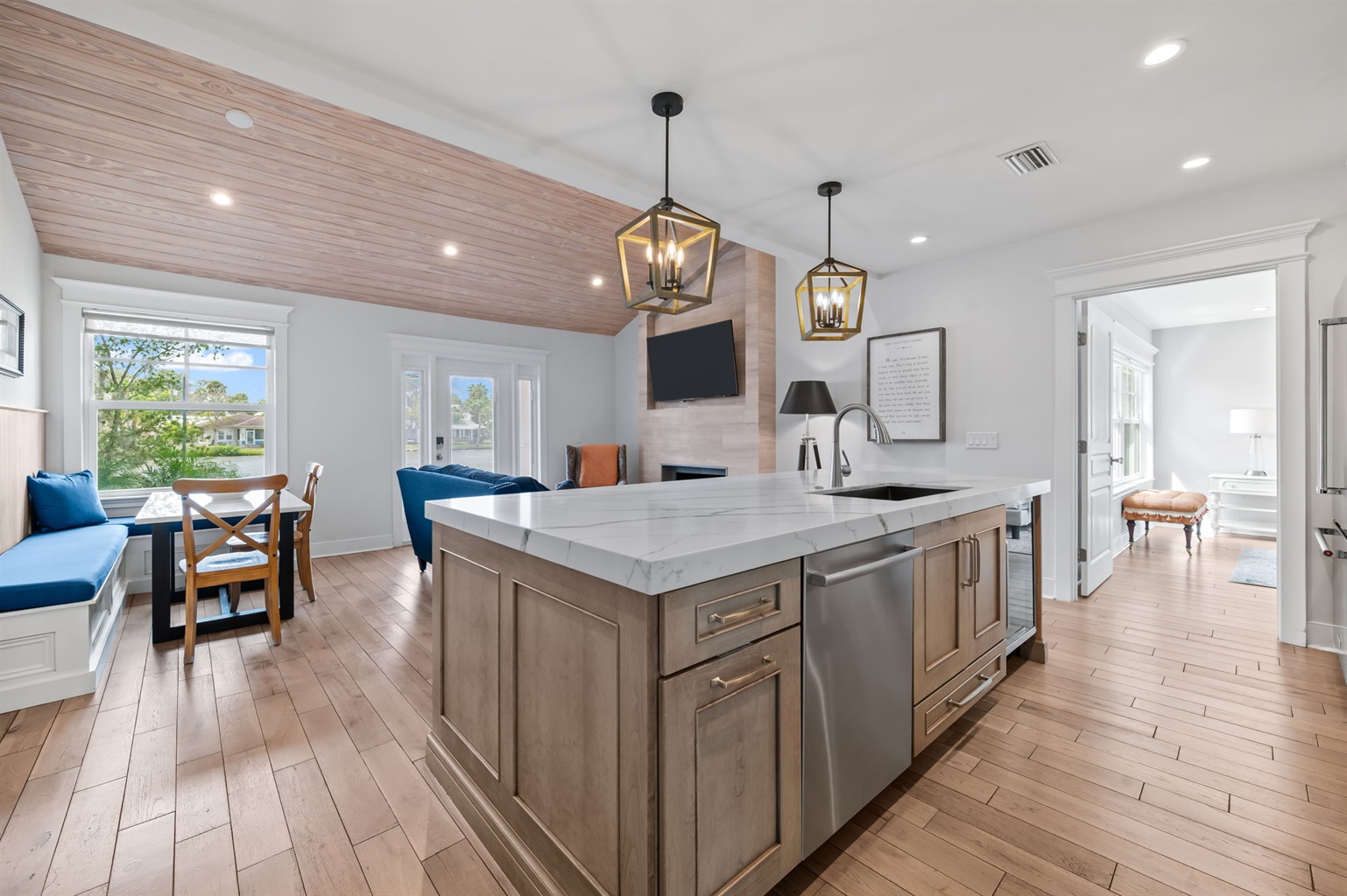 Tall ceilings adorned with warm wood planks, driftwood color flooring and natural light, seamlessly connect the open floor plan, in the living area. Relax on the sofa, catch up with family, or enjoy streaming from your apps on the 55” smart TV.