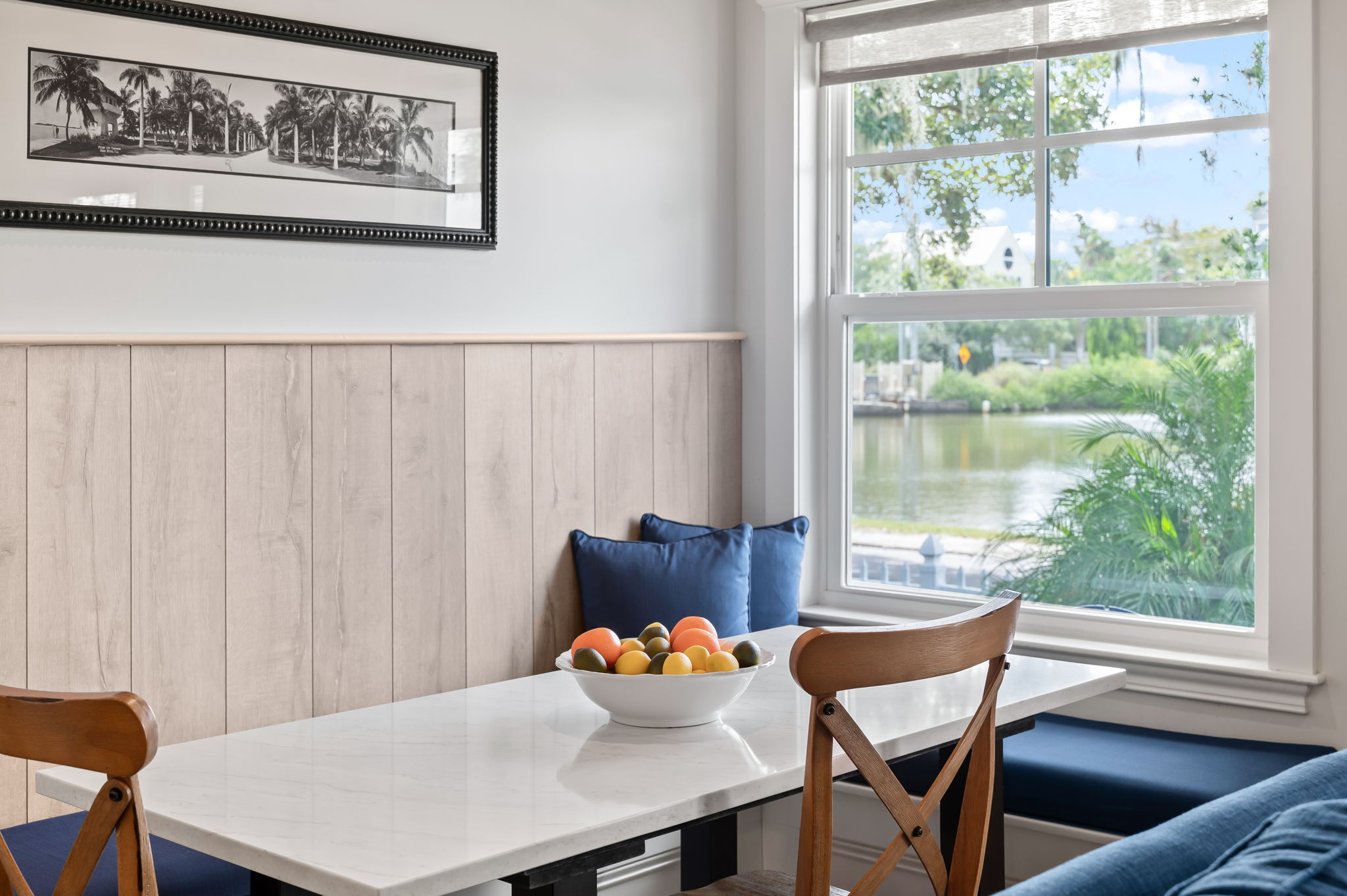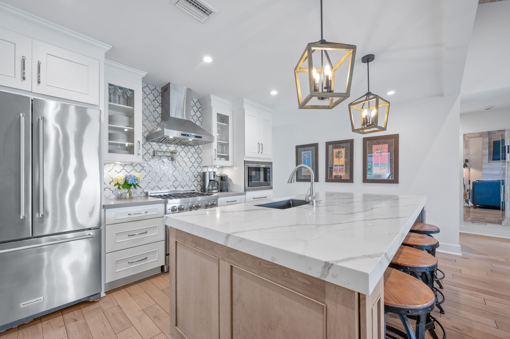 Set the stage for a special occasion dinner or enjoy a casual take-out meal from the abundance of local restaurants. The fully equipped, and well stocked chef’s kitchen, with island bar seating, boasts a natural gas stove, oven and a microwave. With a French door refrigerator and everything you need to prepare a home cooked meal, the dining table seats 6, with a lake view.
