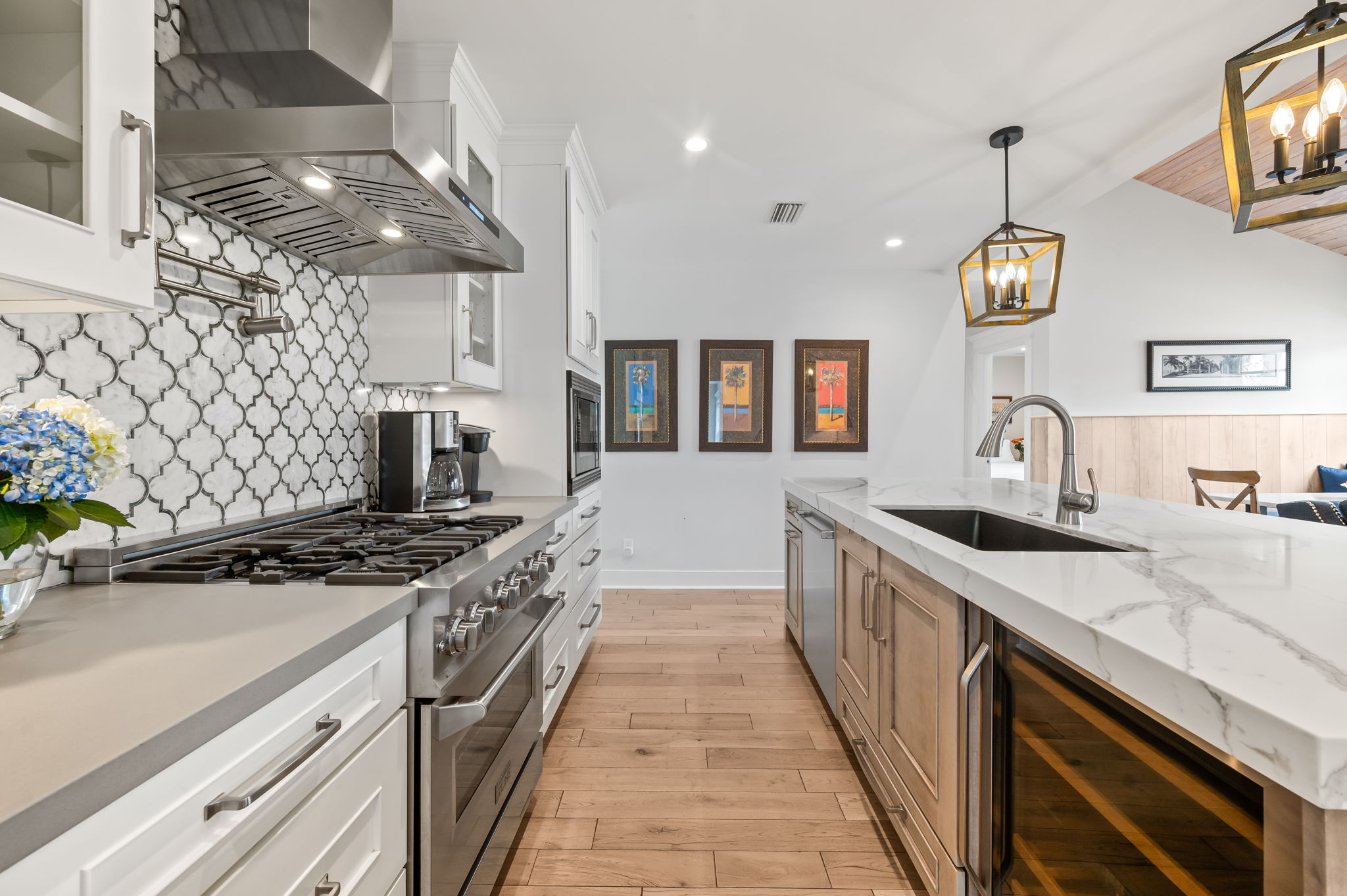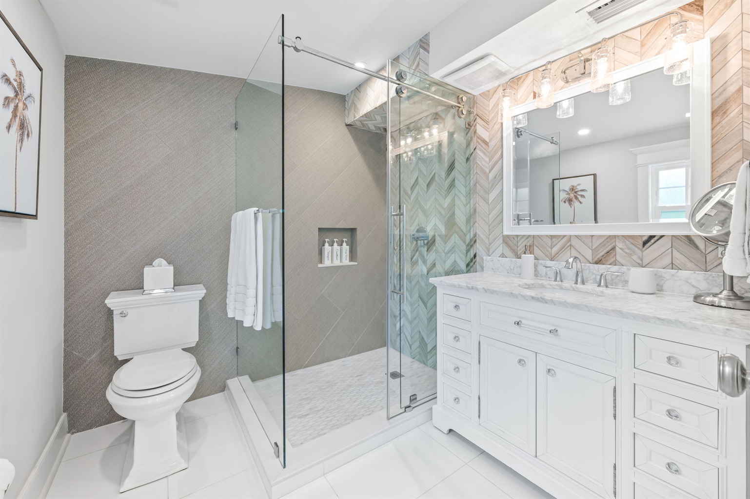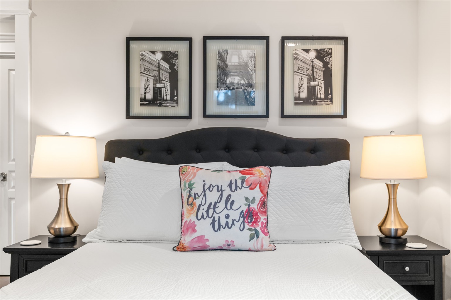 Ambient lighting, luxurious bed mattresses, and room darkening shades add depth, while creating a warm and welcoming retreat. All 3 bedrooms are adorned with 100% cotton linens, quality pillows, wood hangers and tasteful décor. A luggage rack, clothing storage, usb port outlets, wood hangers and lamps are provided in each bedroom.
