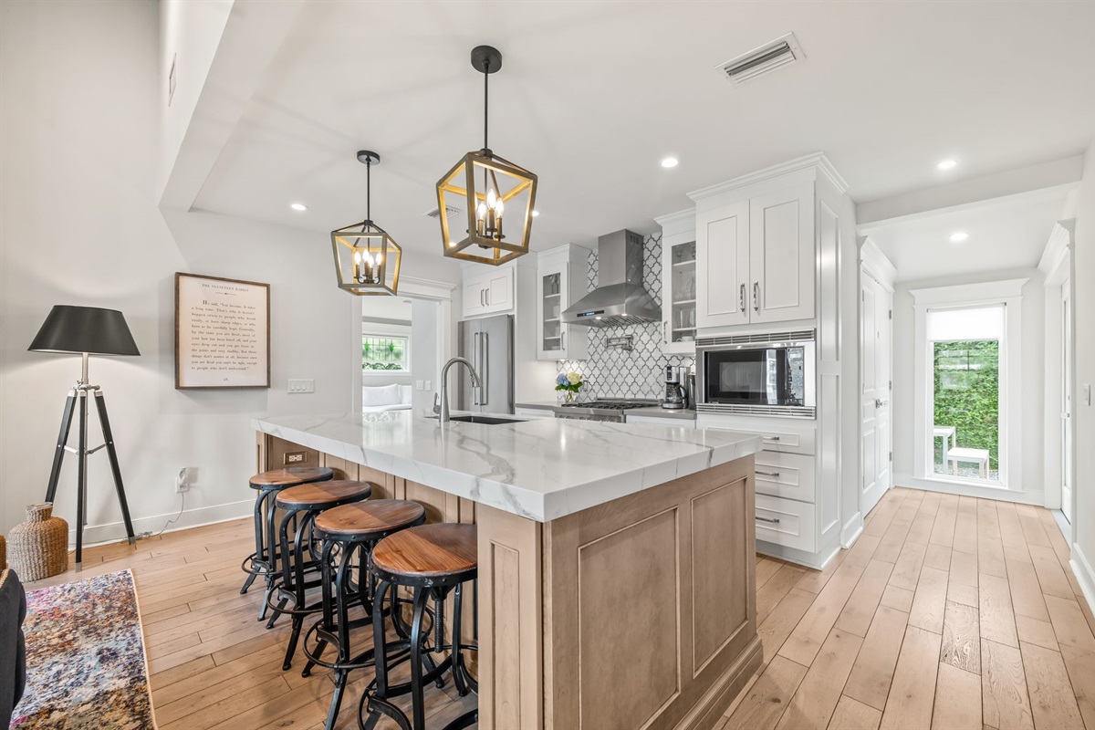 Set the stage for a special occasion dinner or enjoy a casual take-out meal from the abundance of local restaurants. The fully equipped, and well stocked chef’s kitchen, with island bar seating, boasts a built-in wine cooler, a natural gas stove, oven and a microwave. With a French door refrigerator and everything you need to prepare a home cooked meal, the dining table seats 6, with a lake view.